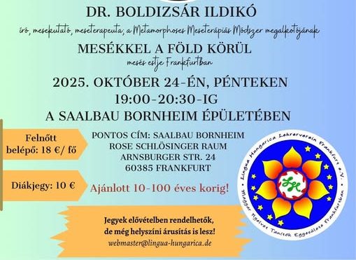 Október 24-én Frankfurtban lesz meseestem, és az a terv, hogy meséken keresztül beutazzuk az egész világot. Gyertek, kedves frankfurtiak, dőljetek hátra, lazítsatok, és engedjétek magatokba a földkerekség legszebb történeteit!